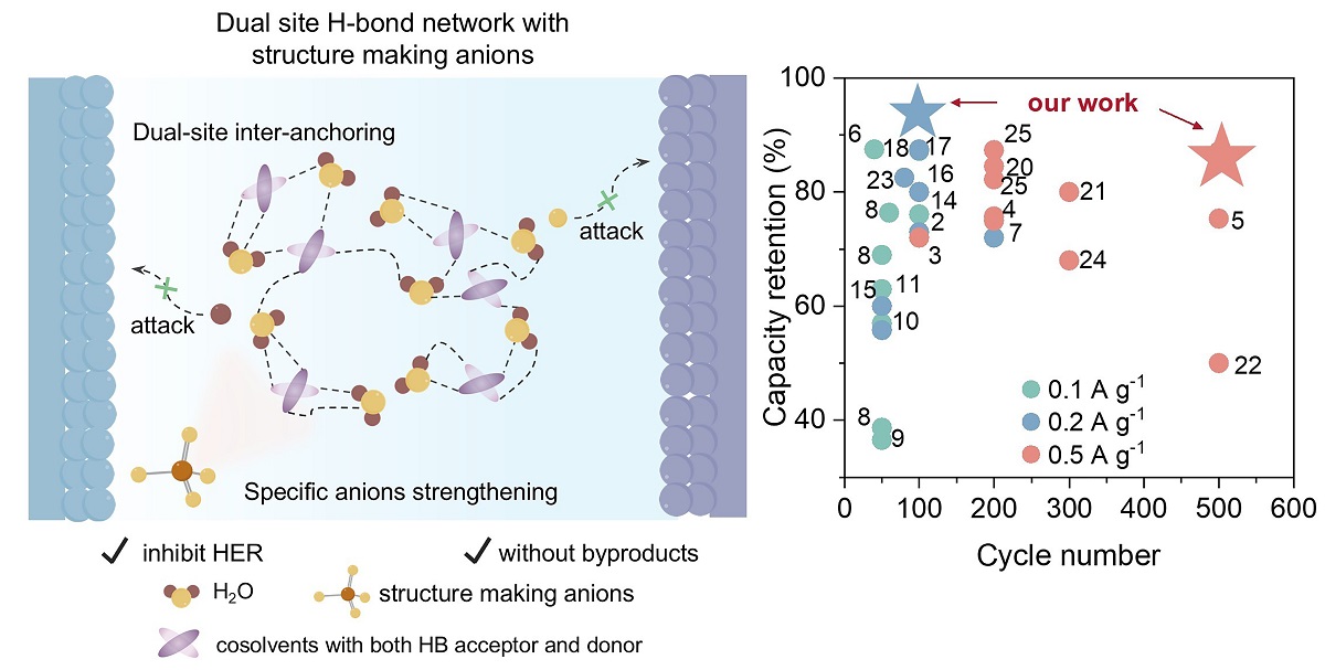 近日(ri),我(wo)所無機(jī)膜與催化新(xin)材(cai)料研究組(504組)楊維(wei)慎研究員(yuan)、朱凱月研究員(yuan)團(tuán)隊(duì)在(zai)釩基水係(xi)鋅離子(zi)電(dian)池研究中(zhong)取得新(xin)進(jin)展(zhan)。團(tuán)隊(duì)通(tong)過(guo)在(zai)電(dian)解液中(zhong)構建(jian)互鎖型強氫鍵網絡,有(yǒu)效降低了(le)水溶劑中(zhong)氧咊(he)氫的(de)反應活性,從(cong)而抑製(zhi)了(le)正負電(dian)極的(de)腐蝕。