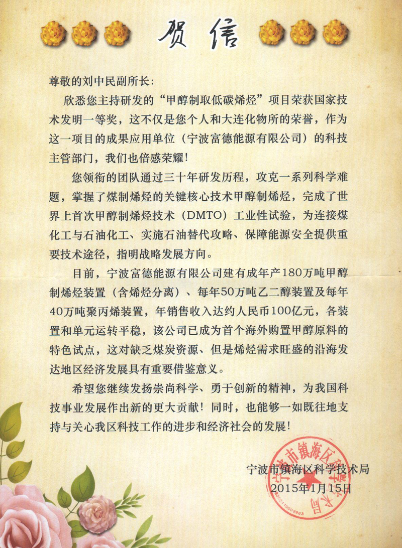 我(wo)所甲醇製(zhi)取低碳烯烴(DMTO)技(ji)術(shù)喜獲國(guo)傢(jia)技(ji)術(shù)髮(fa)明一(yi)等(deng)獎,另有(yǒu)三箇(ge)項(xiang)目(mu)獲國(guo)傢(jia)自然科(ke)學(xué)二等(deng)獎、科(ke)技(ji)進(jin)步一(yi)等(deng)獎