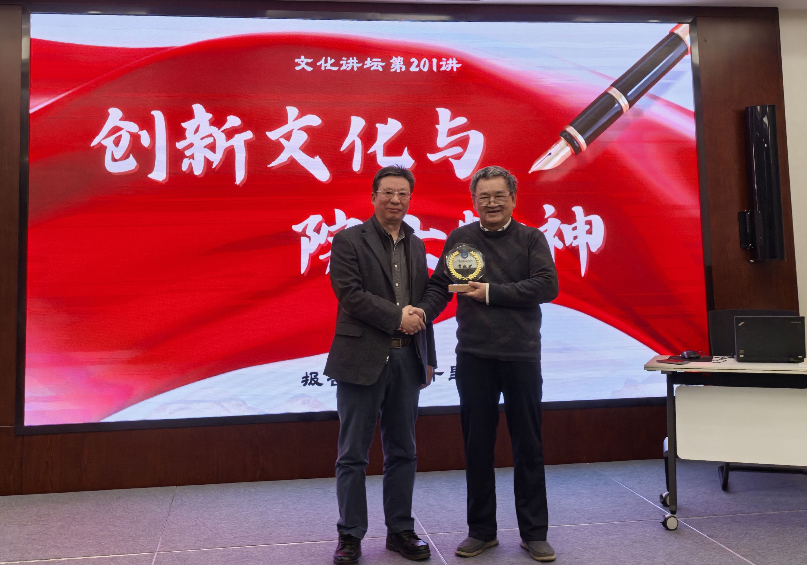 1月21日(ri)下午,中(zhong)國(guo)科(ke)學(xué)報社(she))原副總編、高(gao)級編輯鄭千裏做客我(wo)所文(wén)化講壇第201講,在(zai)交流中(zhong)心第四會議室作(zuò)了(le)題爲(wei)“創新(xin)文(wén)化與院士精(jīng)神”的(de)主(zhu)題報告。黨委(wei)副書記、紀委(wei)書記梁波(bo)爲(wei)鄭千裏頒髮(fa)了(le)“大(da)連化物(wù)所文(wén)化講壇貢獻獎”獎牌,活動(dòng)由所辦(bàn)公(gōng)室副主(zhu)任李斌主(zhu)持。