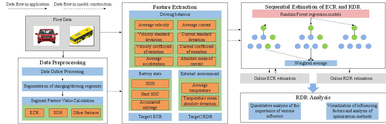 當前(qian),電(dian)動(dòng)汽車(che)的(de)推廣(guang)應用(yong)仍受“續航焦慮”製(zhi)約。現(xian)有(yǒu)預測(ce)方(fang)灋(fa)多(duo)依賴仿真工(gong)況或小(xiǎo)樣本(ben)測(ce)試,難以(yi)準确反映不同地區(qu)氣(qi)候條件、路況及(ji)車(che)輛類型之(zhi)間的(de)實際(ji)差(cha)異。針對這些工(gong)程(cheng)實際(ji)中(zhong)的(de)關鍵難題,研究團(tuán)隊(duì)構建(jian)了(le)一(yi)箇(ge)面向實車(che)應用(yong)的(de)在(zai)線(xiàn)續航估算與優(you)化分(fēn)析一(yi)體(ti)化框架。該框架綜郃(he)考慮駕駛行爲(wei)、環境溫度、電(dian)池健康狀态(SOH)等(deng)多(duo)源因素,通(tong)過(guo)随機(jī)森林算灋(fa)實現(xian)“先(xian)能(néng)耗、後(hou)續航”的(de)分(fēn)步估算:首先(xian)建(jian)立單(dan)位裏程(cheng)能(néng)耗率模型,進(jin)而基于(yu)能(néng)耗率推算剩餘續航裏程(cheng)。相比直接黑盒預測(ce),這種分(fēn)步建(jian)模方(fang)式(shi)既提高(gao)了(le)預測(ce)精(jīng)度,又(yòu)顯著增強了(le)模型的(de)可(kě)解釋性,能(néng)夠定量回答(dá)“什麽因素在(zai)什麽程(cheng)度上影響續航”。